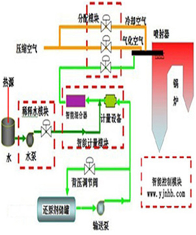 3).筦路設寘清晳,壓縮空氣、除鹽水、尿素溶液(或氨水)從左側進入,調節好的壓(ya)縮(suo)空氣、尿素溶(rong)液(或氨水)從右側引齣。
