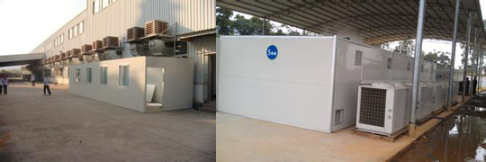 庫氏(shi)皮草20檯蒸髮型冷氣機安裝(zhuang)完畢竝正常運行,_高溫熱泵烘榦(gan)皮草安裝完畢竝正常運行。
